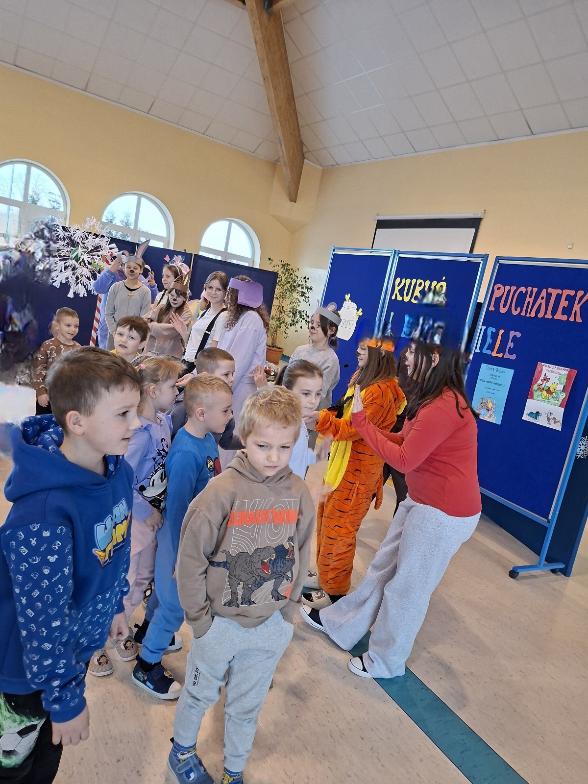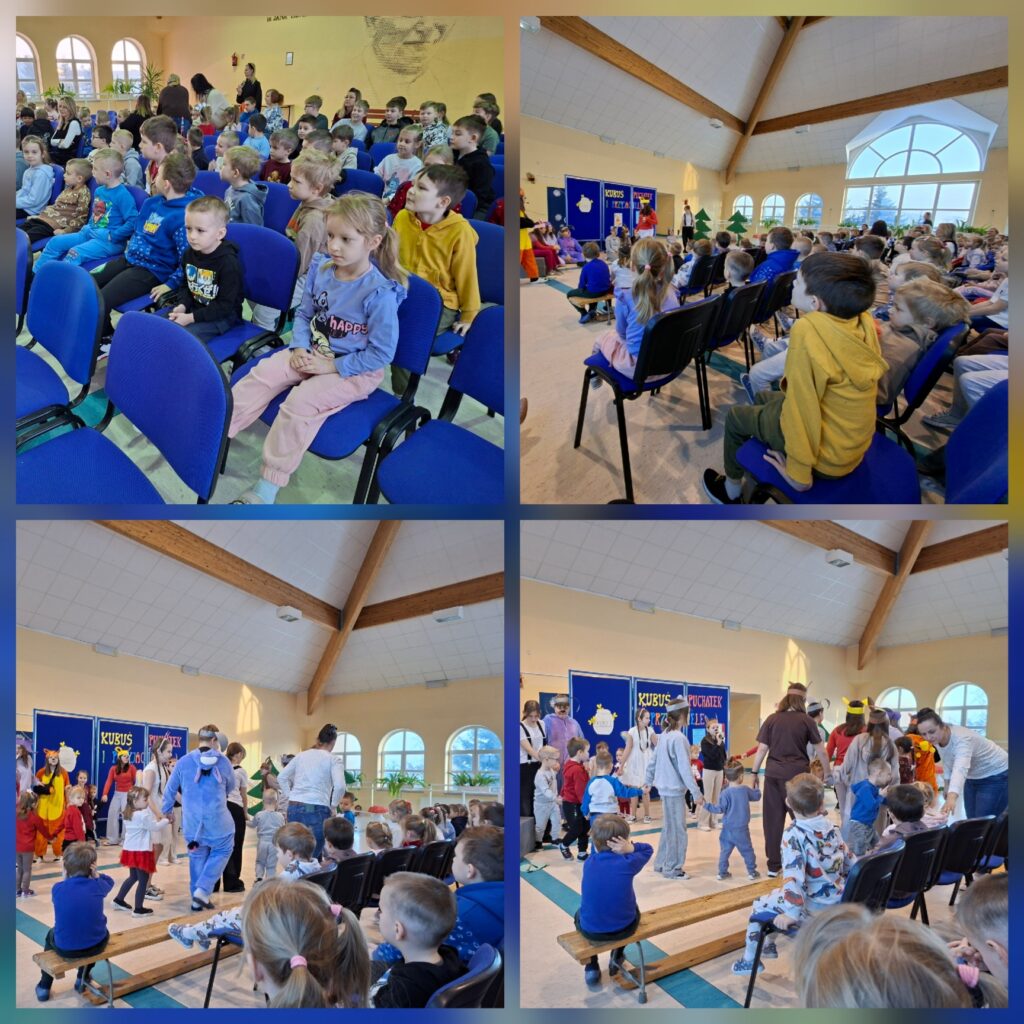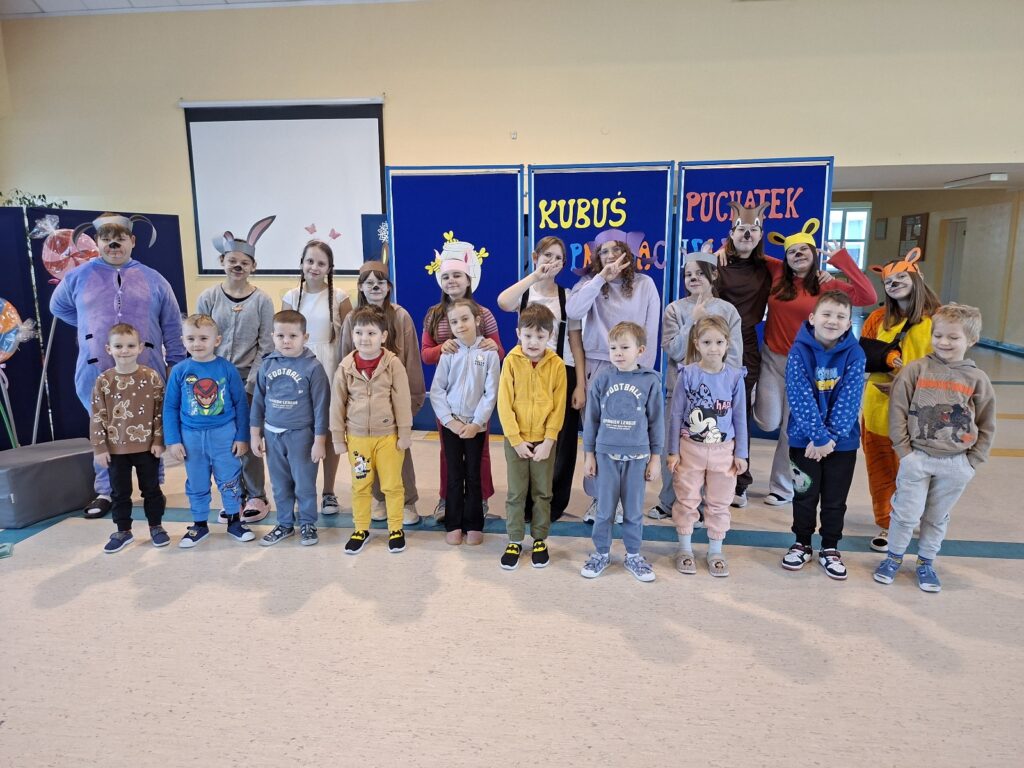 Uczniowie klas V, uczestniczący w kółku teatralnym, działającym w Szkole Podstawowej w Białej Piskiej pod opieką Pani Agnieszki Kowalczyk, zaprosili przedszkolaków na przedstawienie opracowane na podstawie „Kubusia Puchatka”. Znani dzieciom bohaterowie ulubionej książki, w ciekawy i przystępny sposób, przypomnieli zasady kulturalnego zachowania się podczas spożywania posiłków. Przedszkolacy onieśmieleni wizytą w szkolnej auli, z wielką uwagą śledzili występ młodych aktorów, podziwiając ich talenty wokalne, taneczne oraz plastyczne.