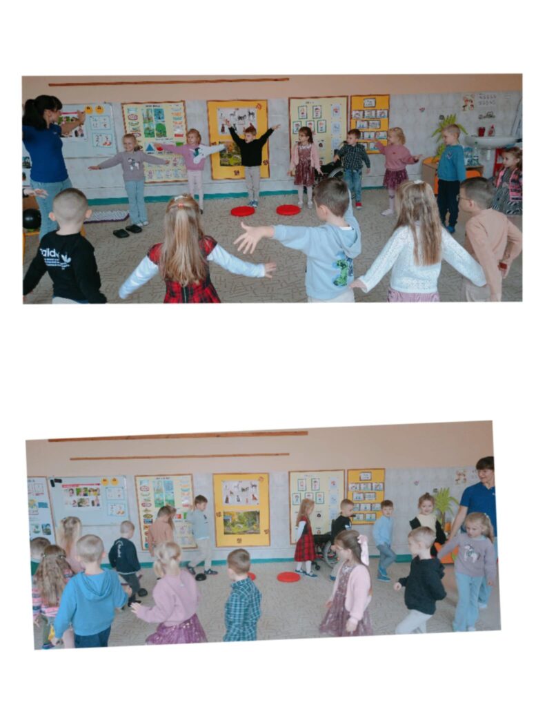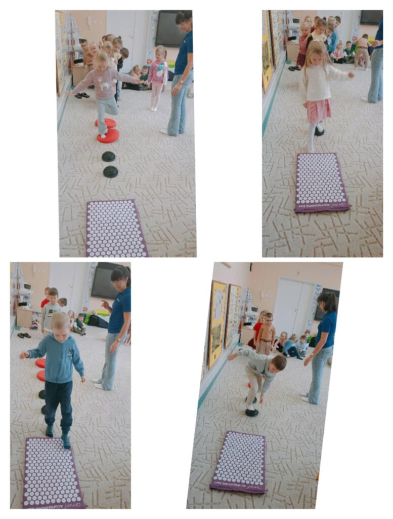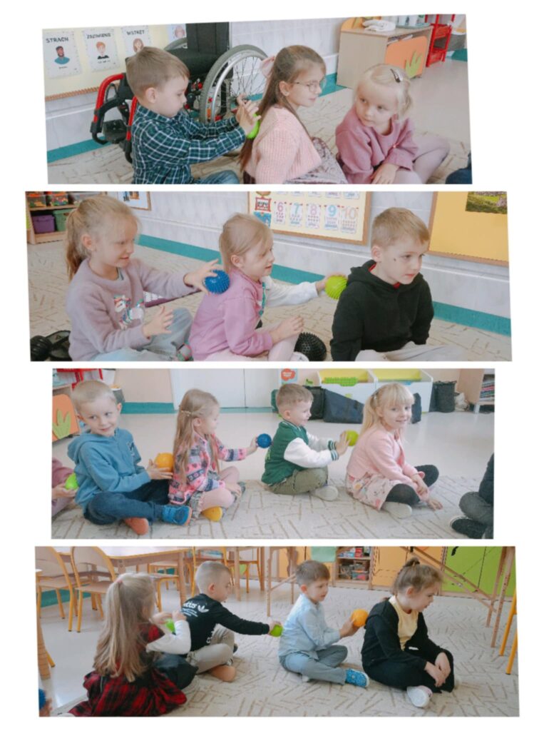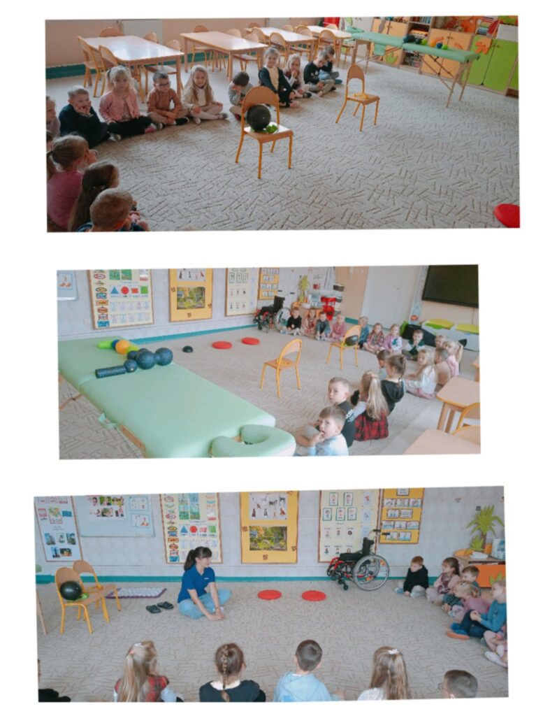 Dnia 23 października 2025r. naszą grupę odwiedziła mama Kamilki. Pani Ilona jest fizjoterapeutką. Na początku spotkania powiedziała na czym dokładnie polega jej praca. Dzieci dowiedziały się, że fizjoterapeuta to osoba, która przez ćwiczenia i zabiegi pomaga ludziom chorym. Wytłumaczyła, że do jej zadań należy m.in. poprawianie sprawności ruchowej poprzez stosowanie odpowiednich zabiegów, masaży i ćwiczeń. Dzieci zapoznały się z różnymi przyrządami, na których mogły poćwiczyć.